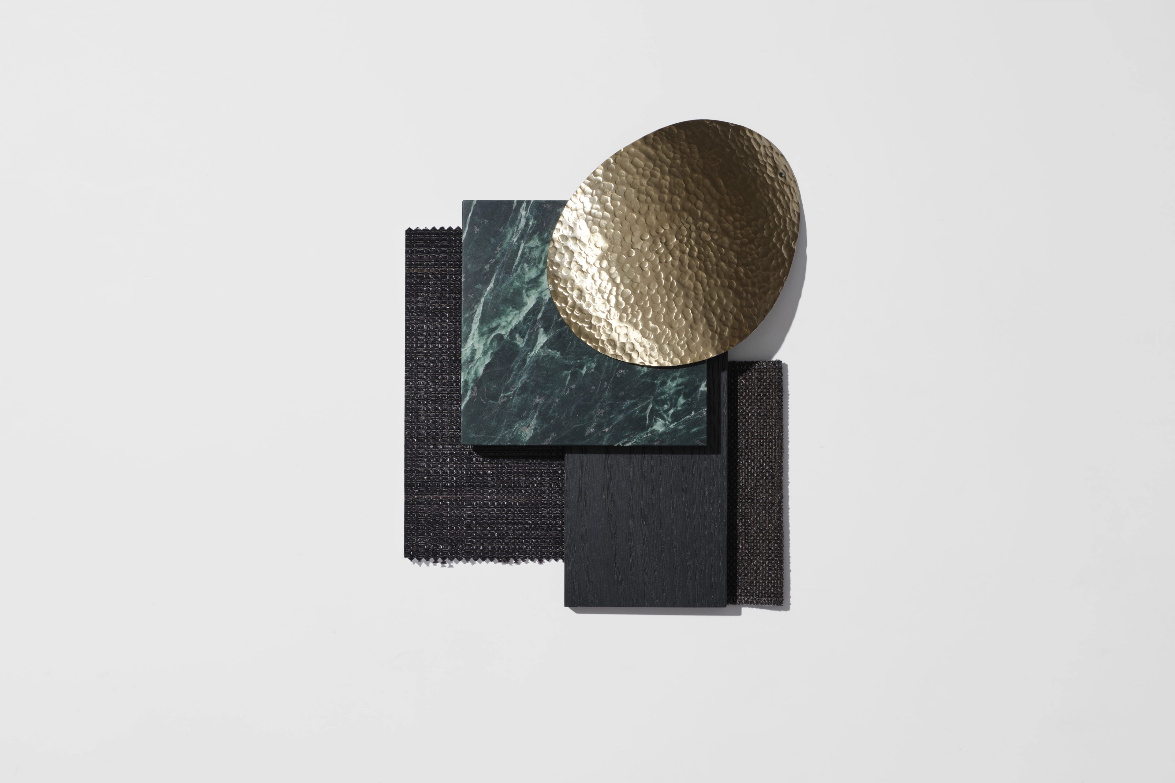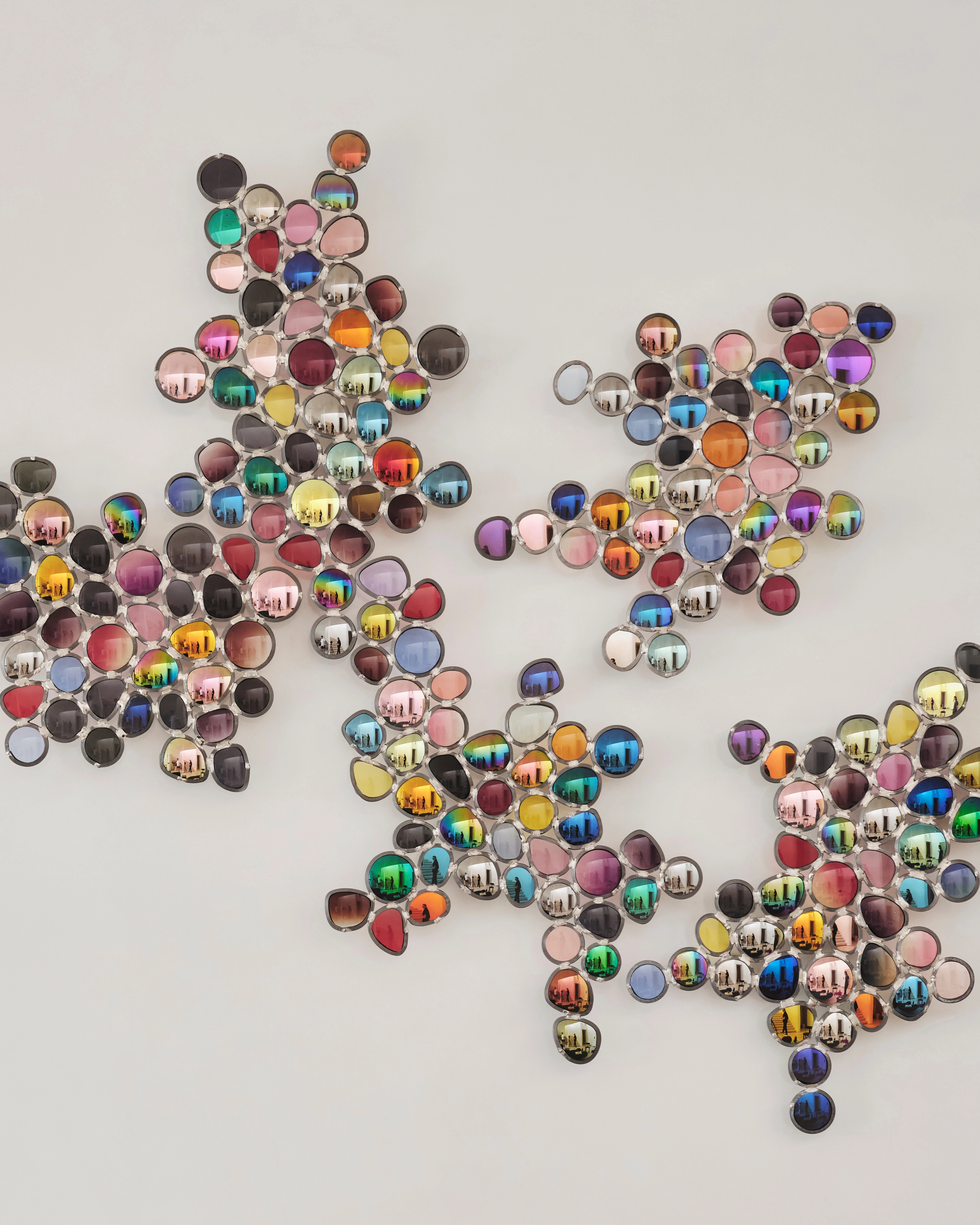 A restrained, gallery-like aesthetic highlights artworks such as a bronze sculpture by Del Kathryn Barton and lens works by Jim Lambie, crafted from fused sunglass lenses that reflect colour, movement, and the surrounding space.