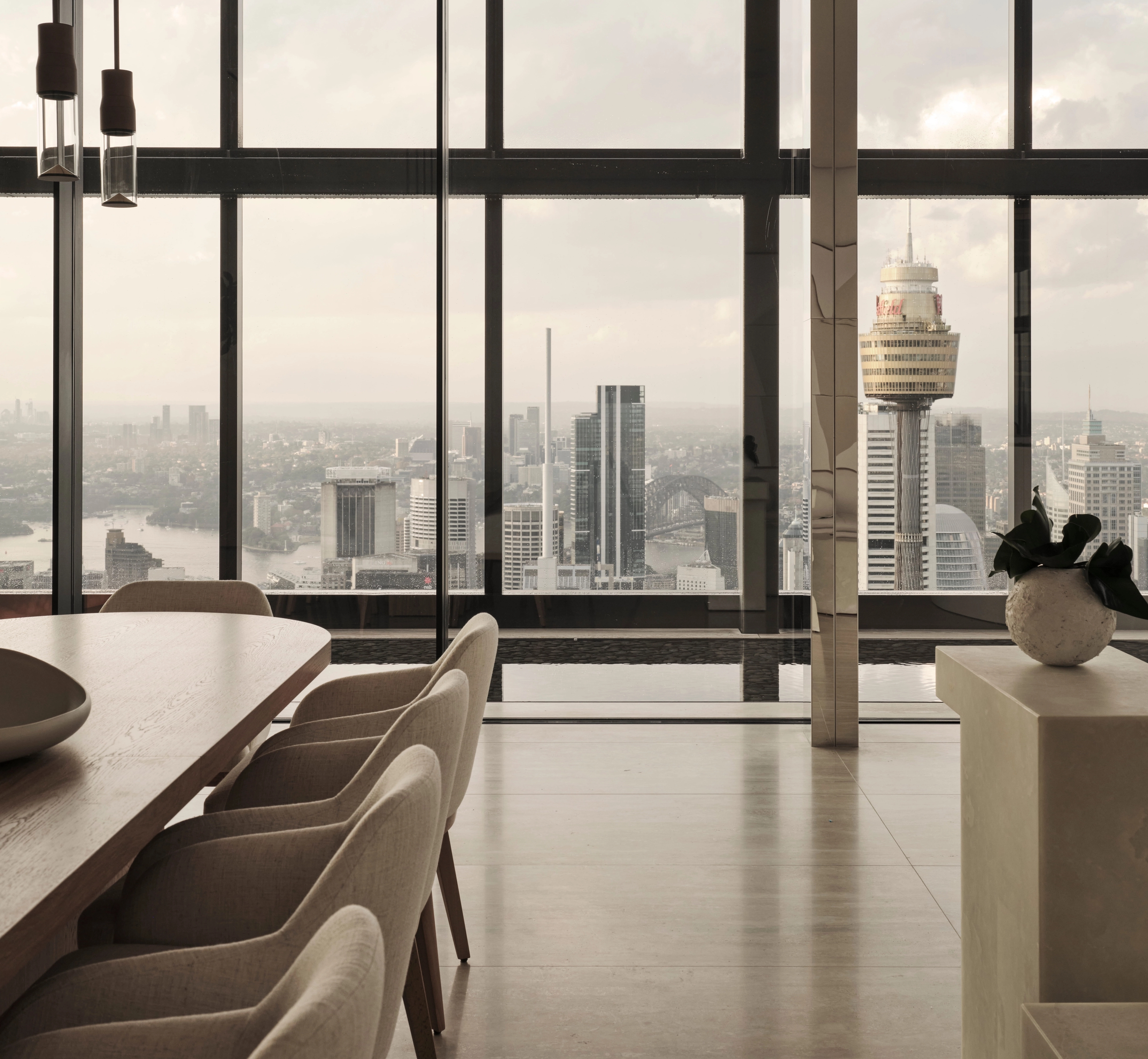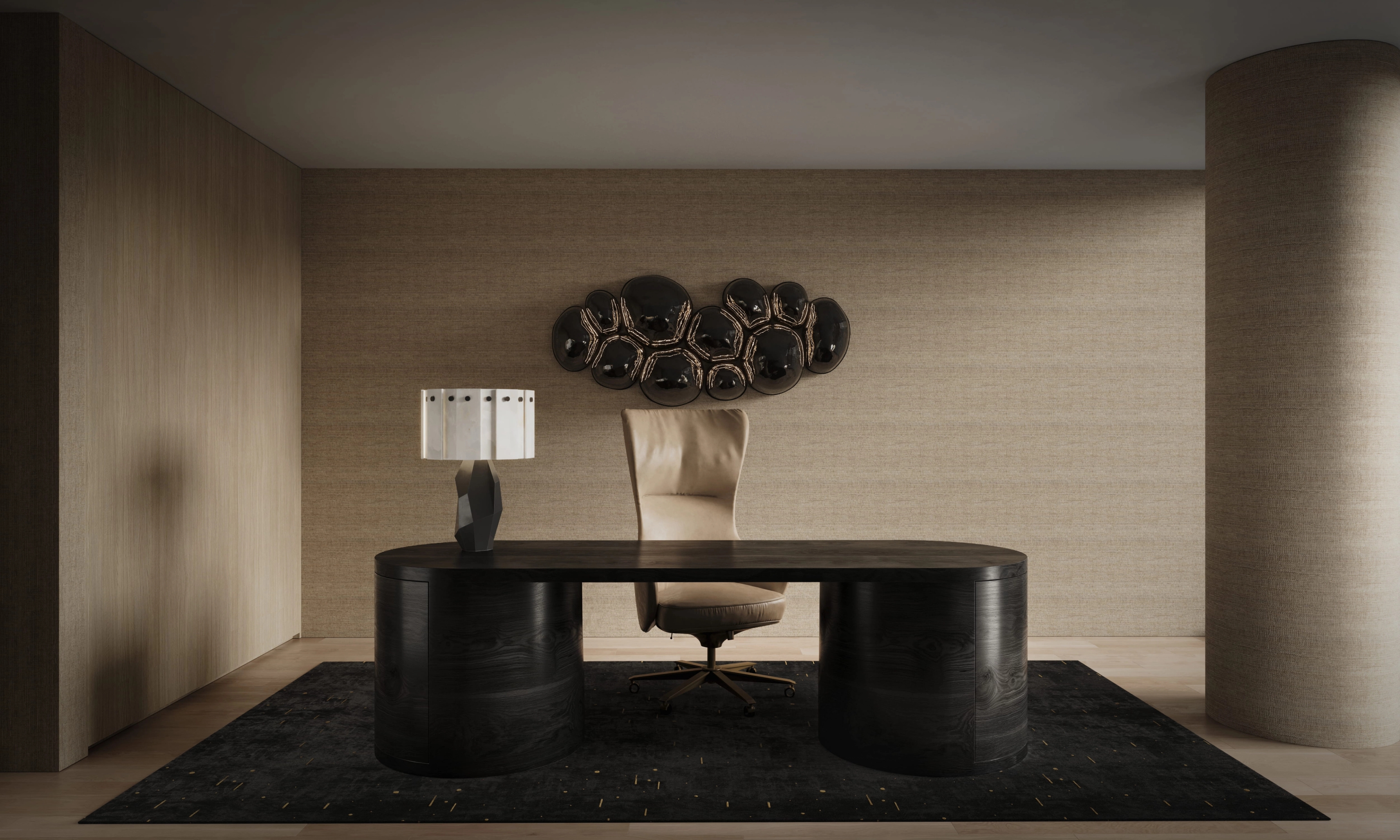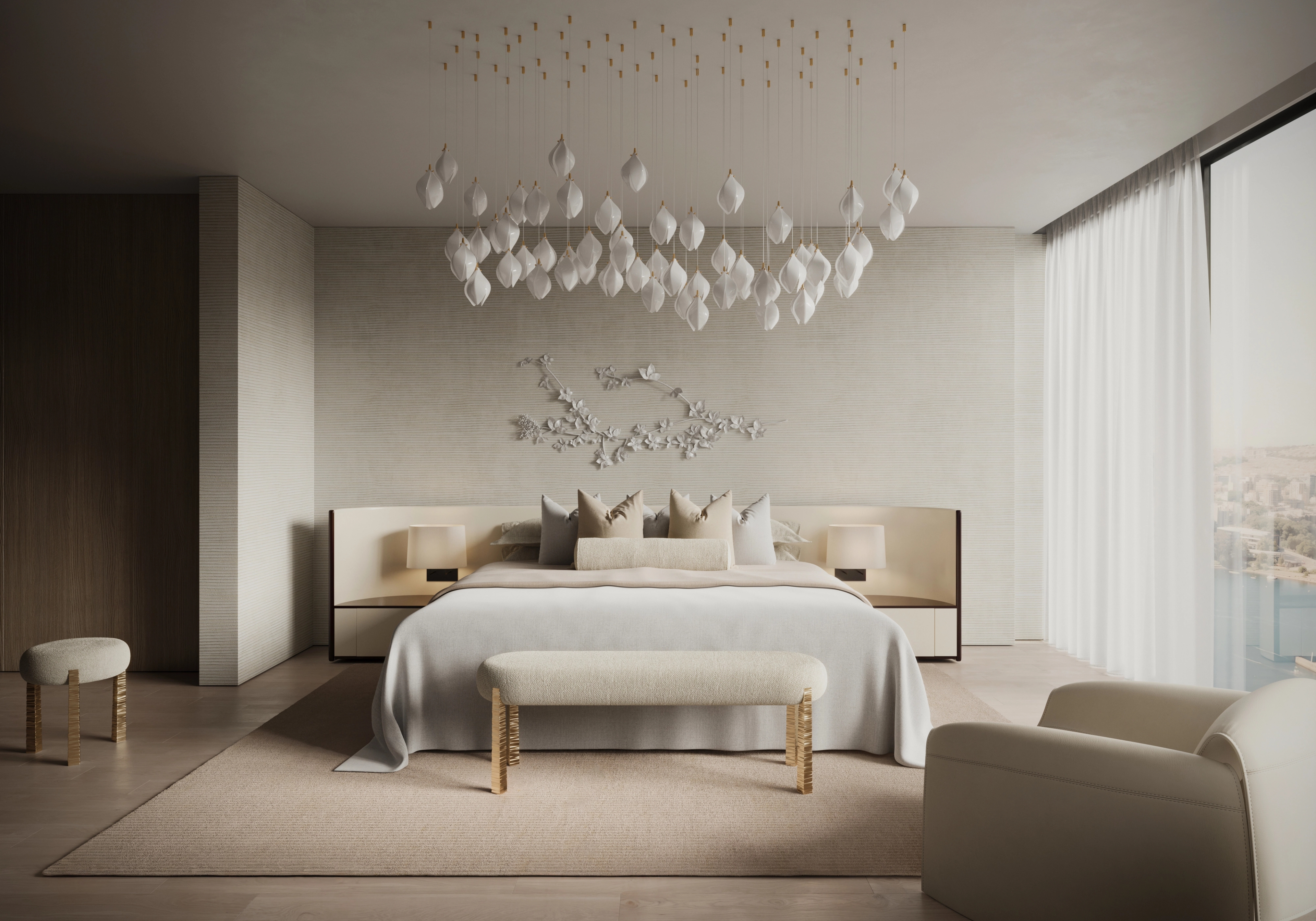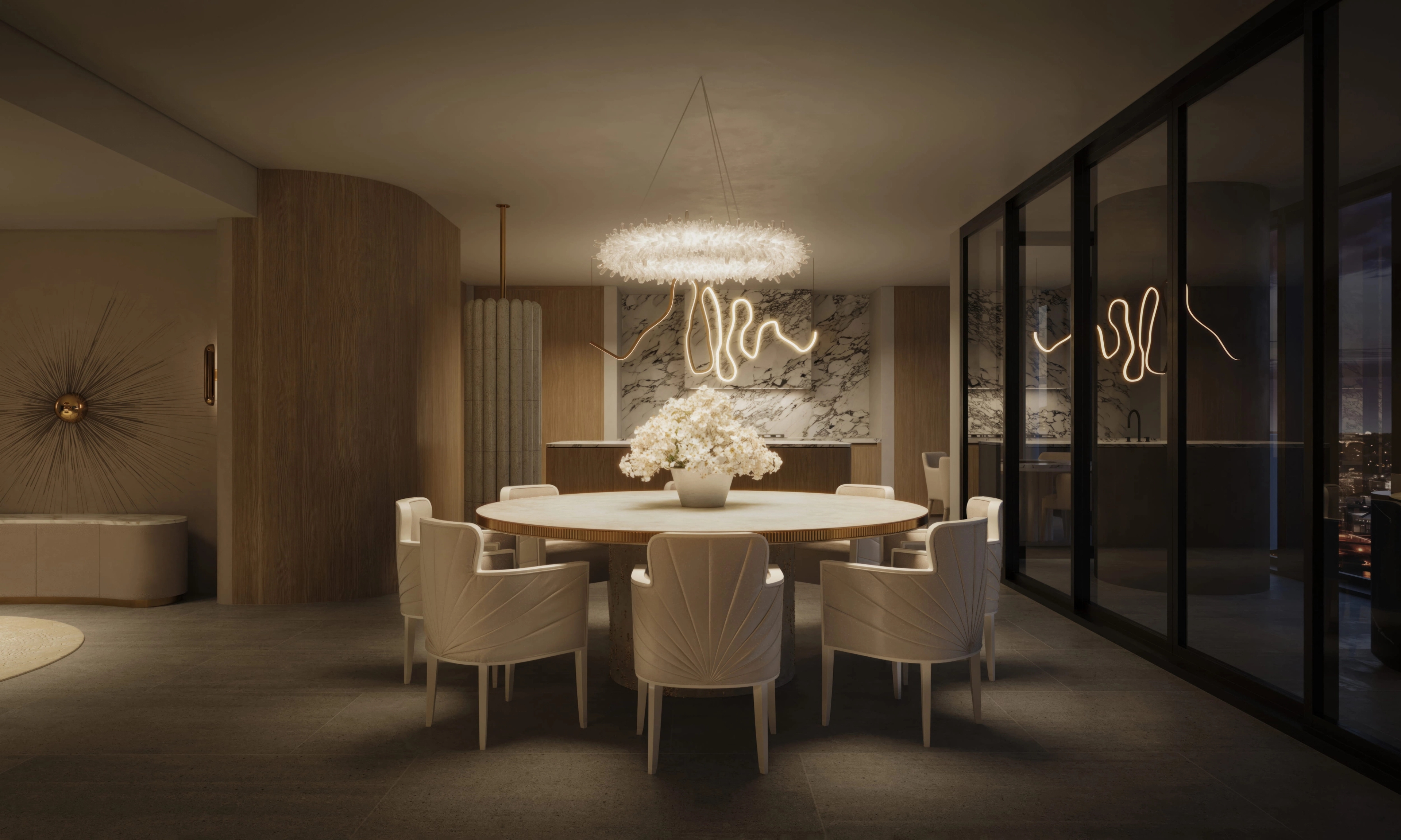 Inspired by the meticulous craftsmanship of a luxury super yacht interior, this FREEMAN & CO residence is conceived as a golden, chamber-like sanctuary in the sky. The home evokes the intimacy of a jewel box, where exotic fine materials and priceless works of art are layered to create an immersive, cinematic environment.