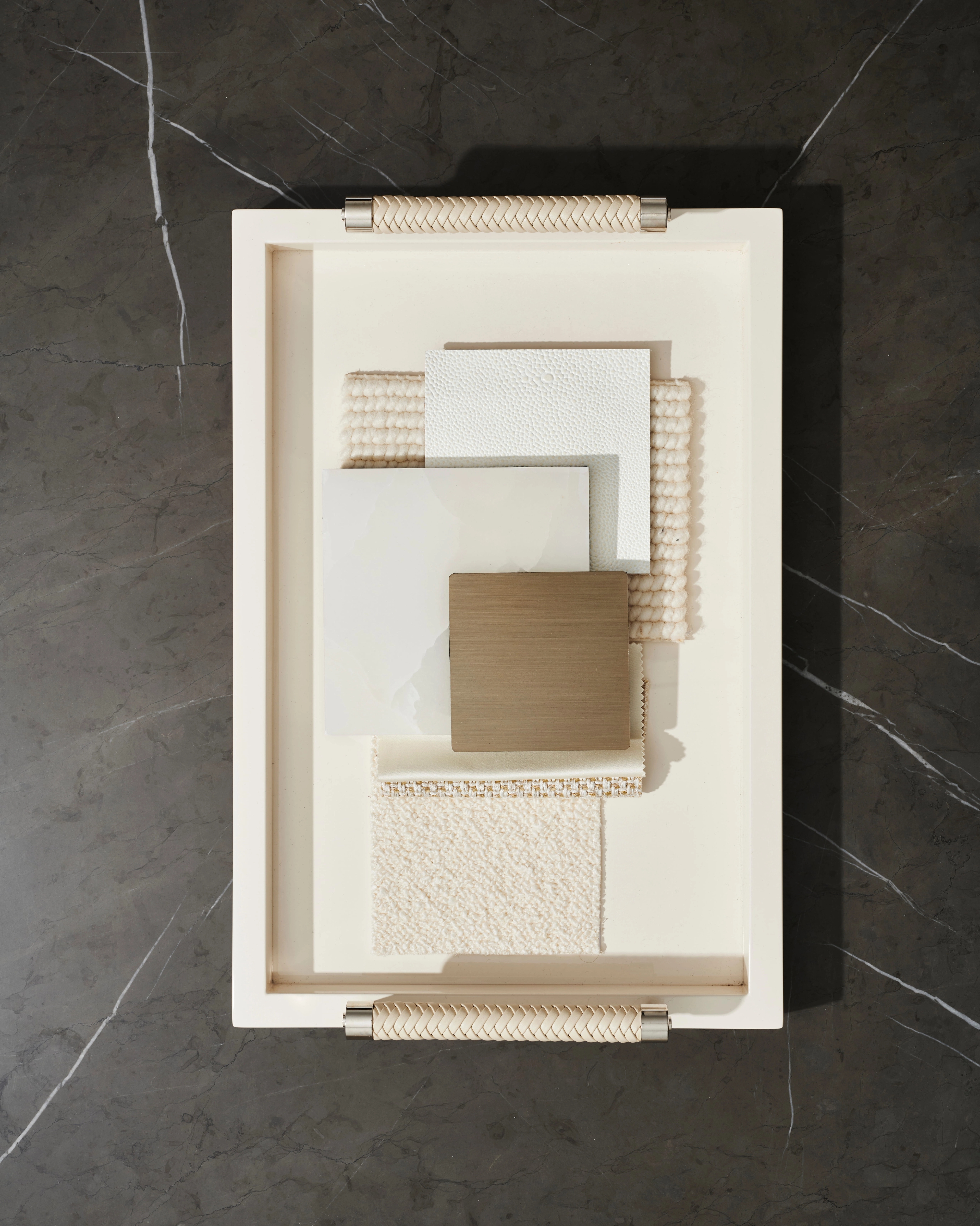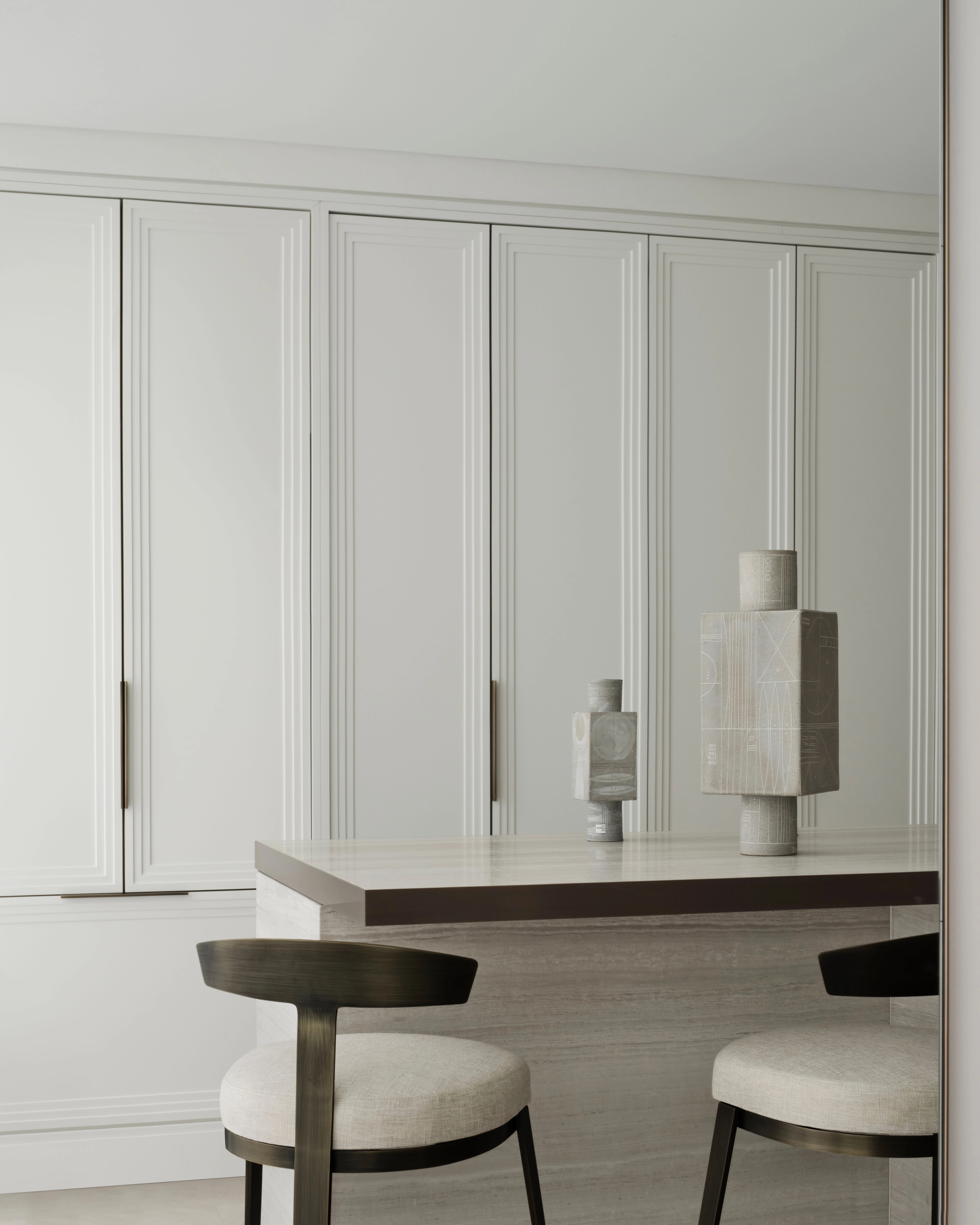 Soft stone selections are harmoniously paired with herringbone flooring, light timber tones, satin champagne metal accents, and moments of traditional panelling. Together, these elements create an atmosphere that is subtle and elegant—akin to a tailored Loro Piana suit—refined in its detailing while thoughtfully referencing classical forms within a modern context.
