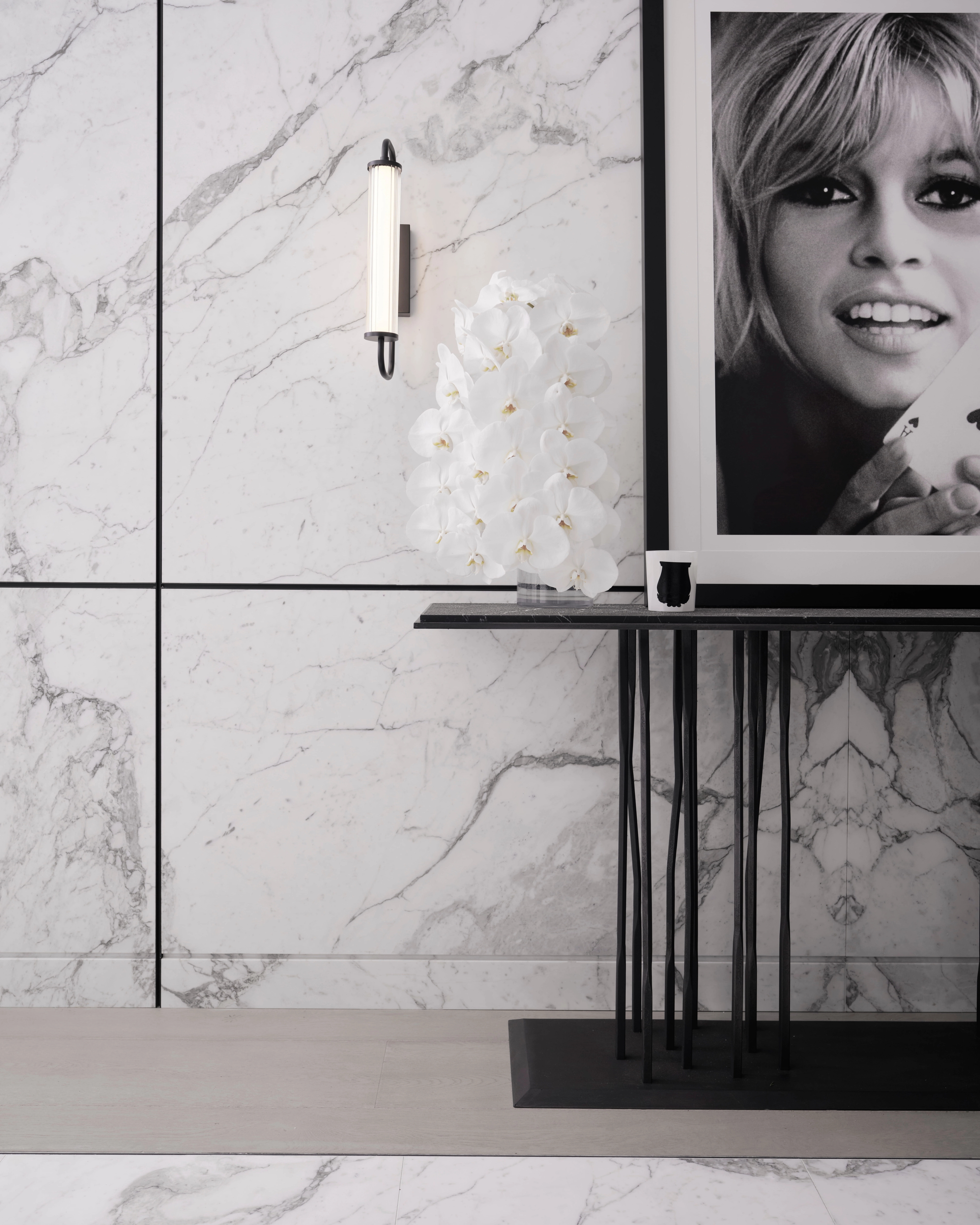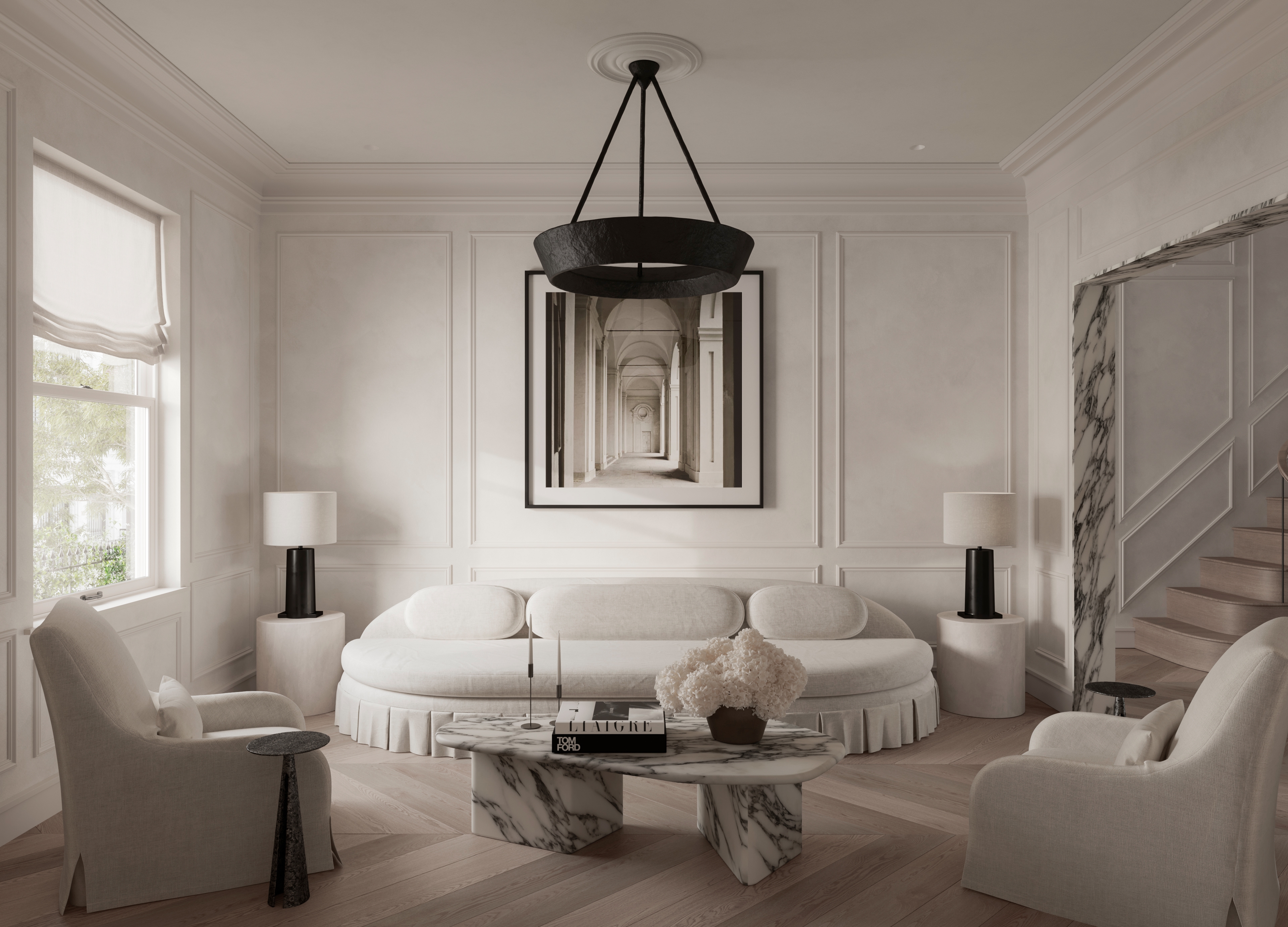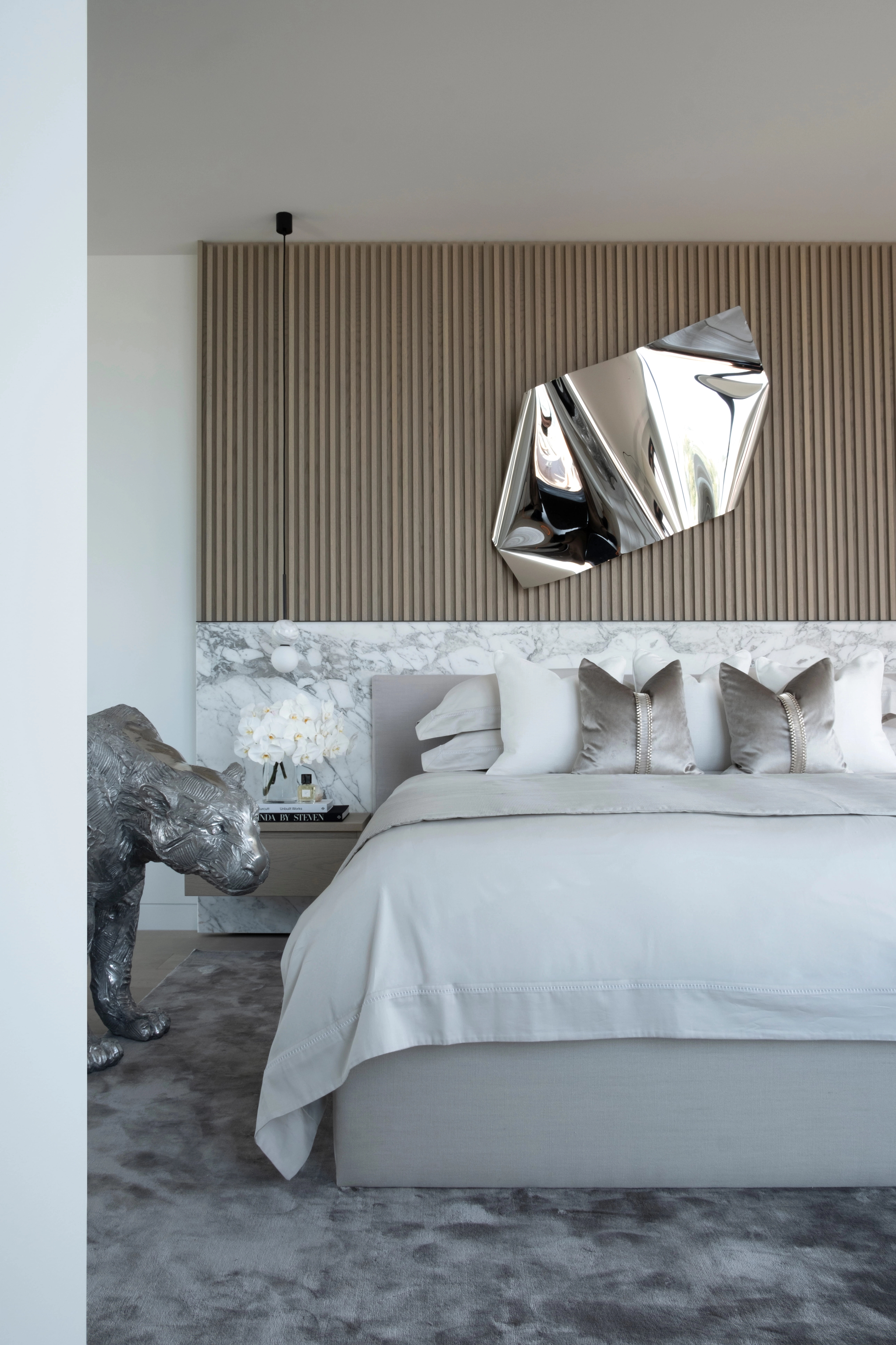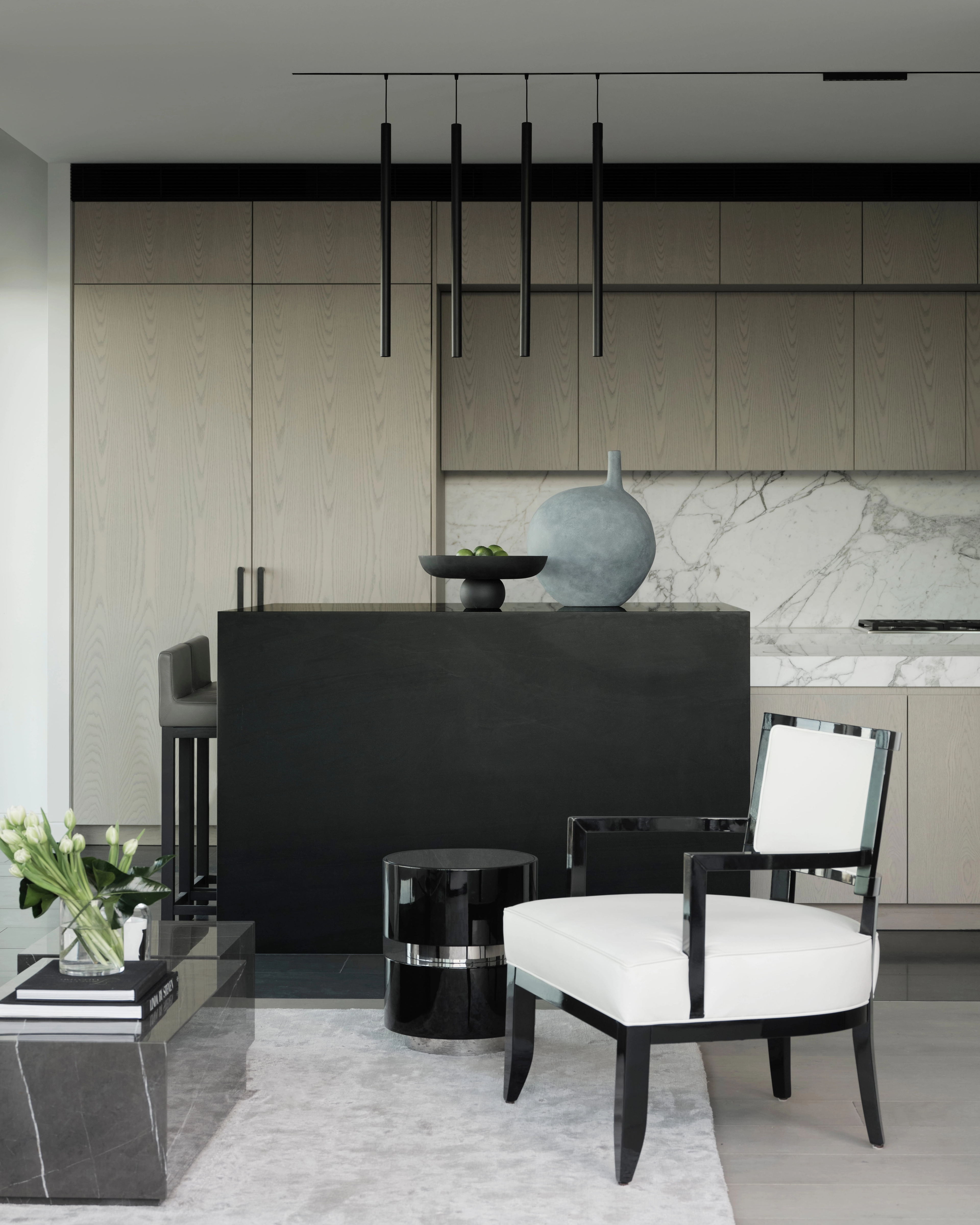 The interior language is grounded in a monochrome palette, amplifying the architectural vision of London-based designer Kelly Hoppen. Through a nuanced interplay of texture, tone, and form, the space balances raw and refined elements, achieving a poised tension between restraint and opulence.