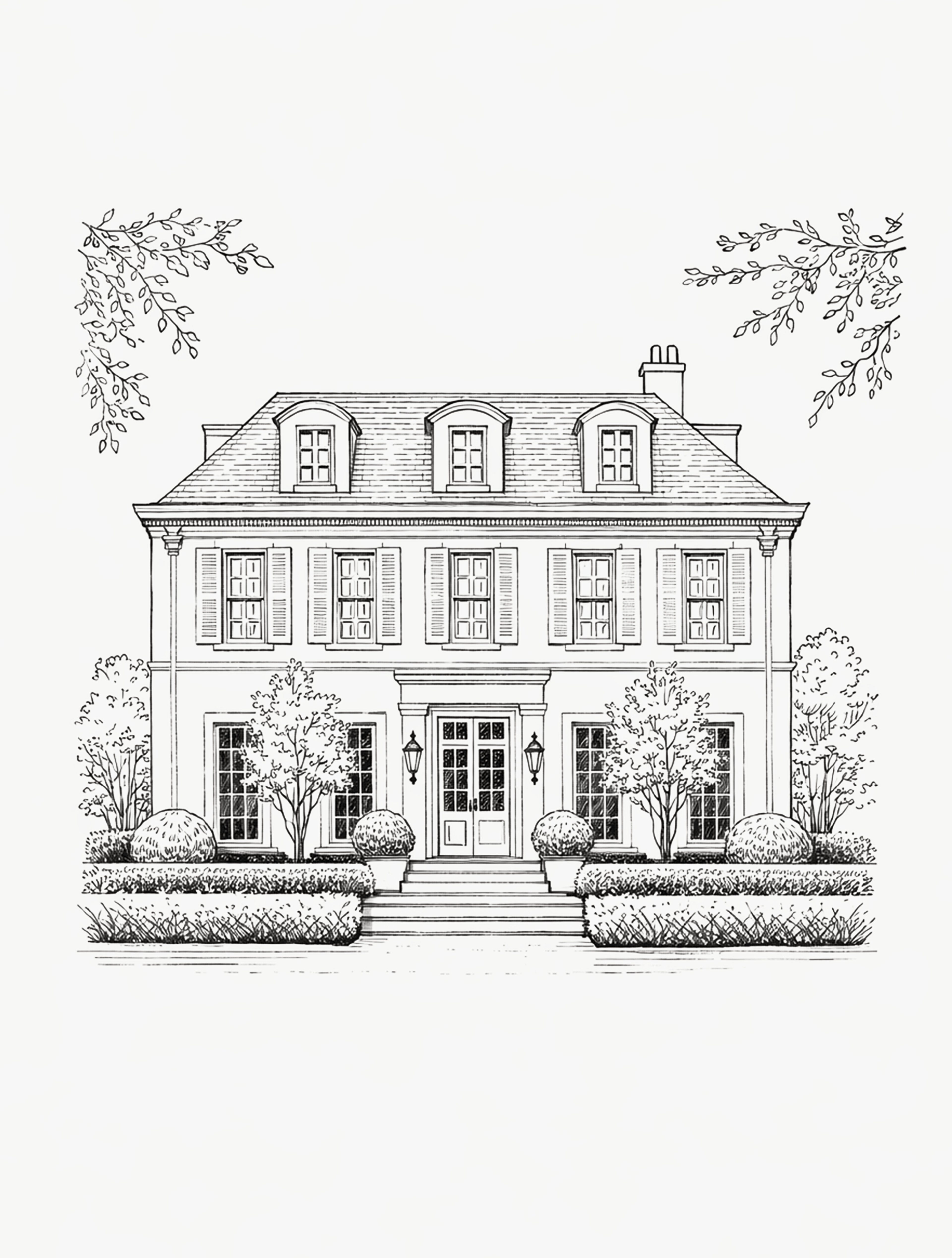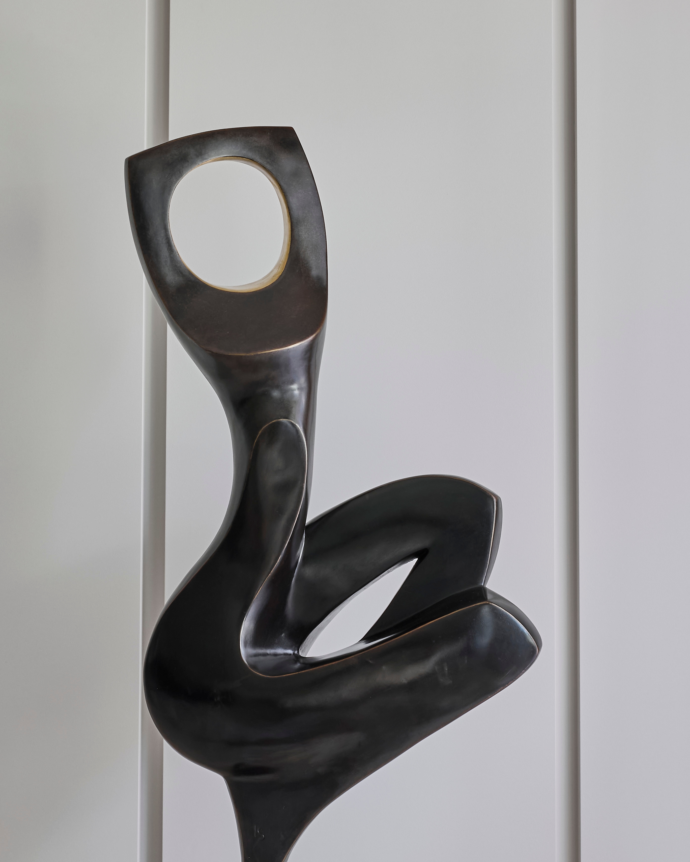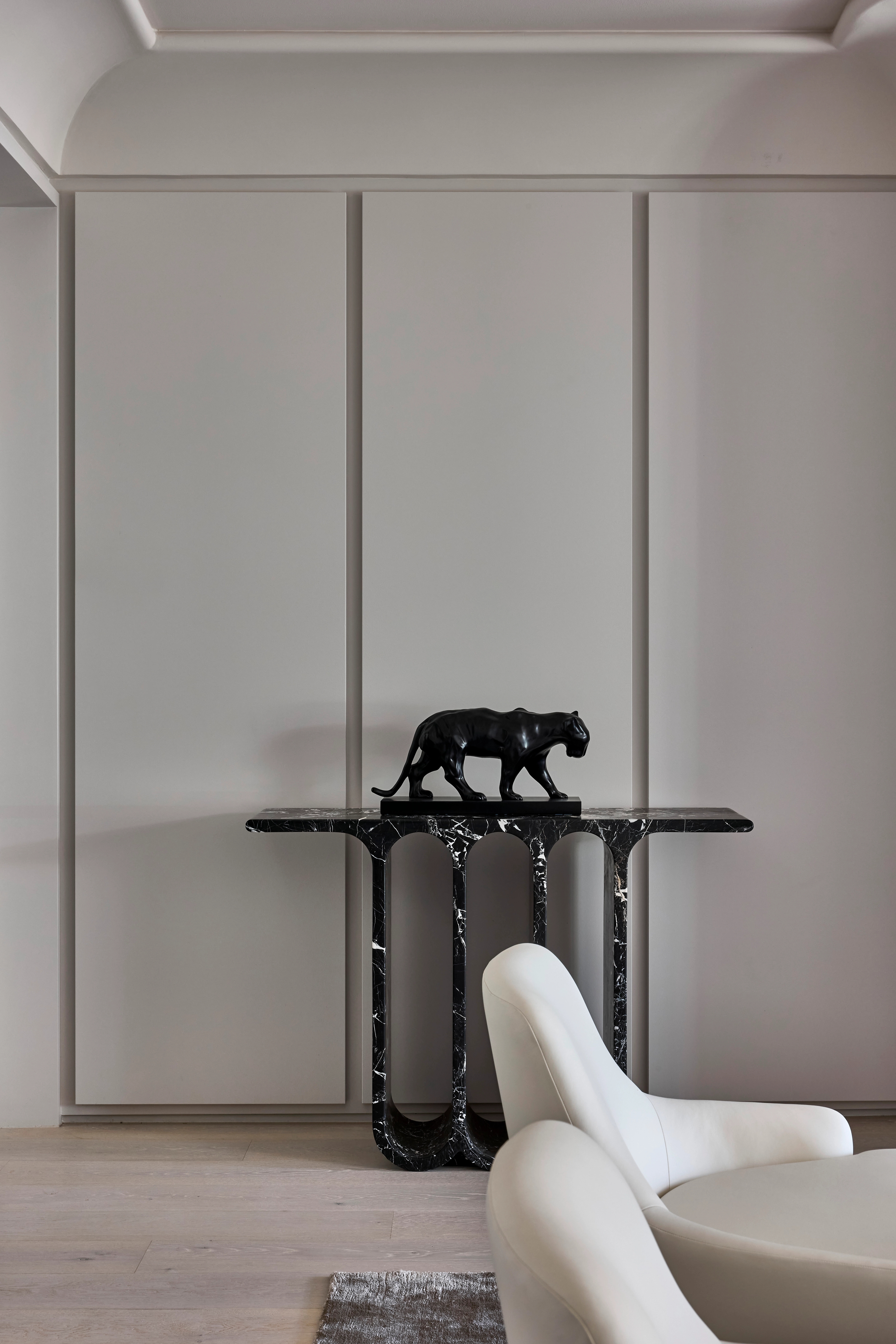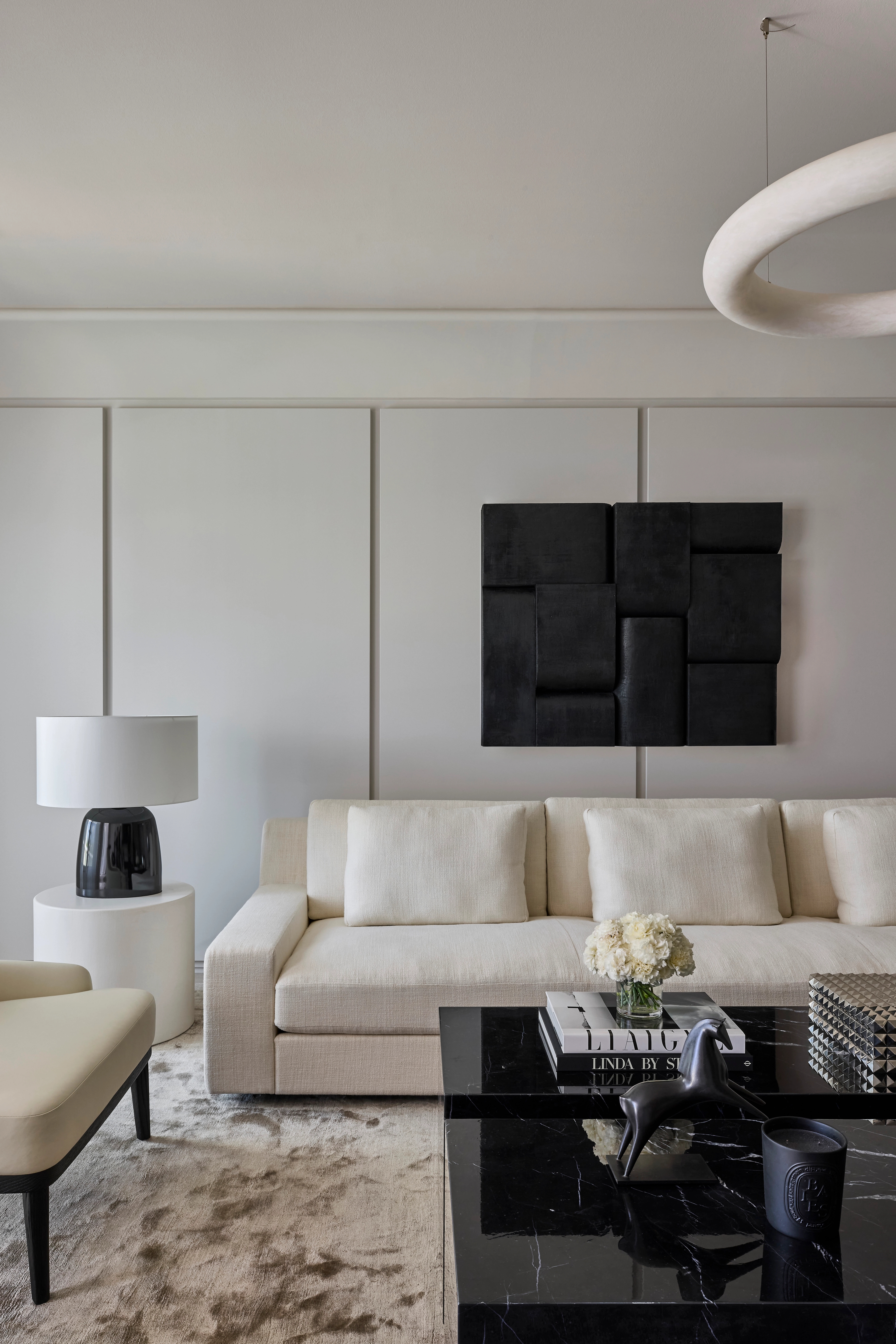 A muted palette of warm whites, ivories, and layered neutrals is contrasted with blackened steel, bronze, and veined marble. Architectural panelling and softened curves introduce rhythm and fluidity to the disciplined geometry.