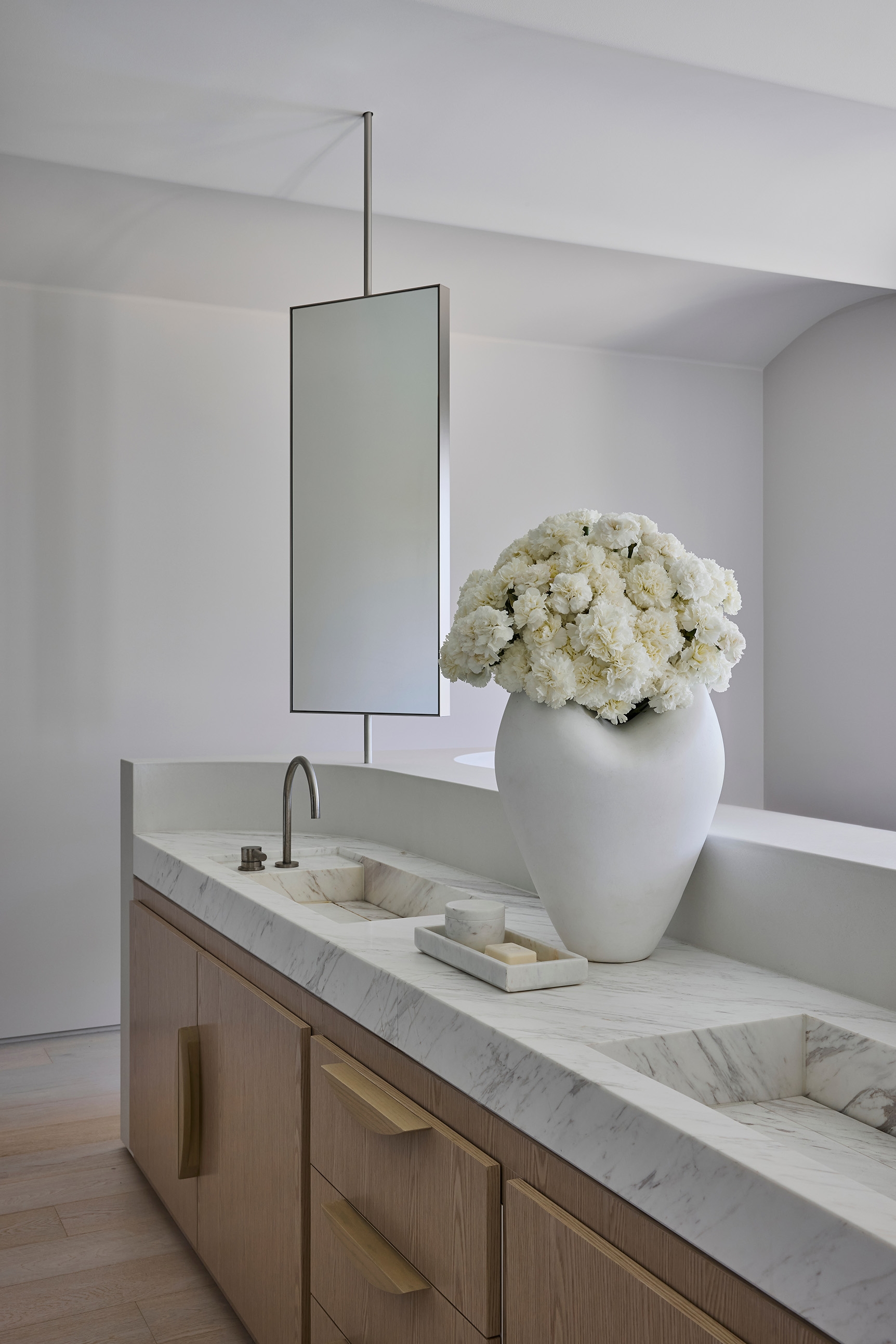 Living spaces are composed with a gallery-like sensibility, anchored by a sculptural marble coffee table, bespoke sofas, and an alabaster circular pendant. Curated works by Paul Bik and Australian sculptors reinforce the dialogue between art and architecture.