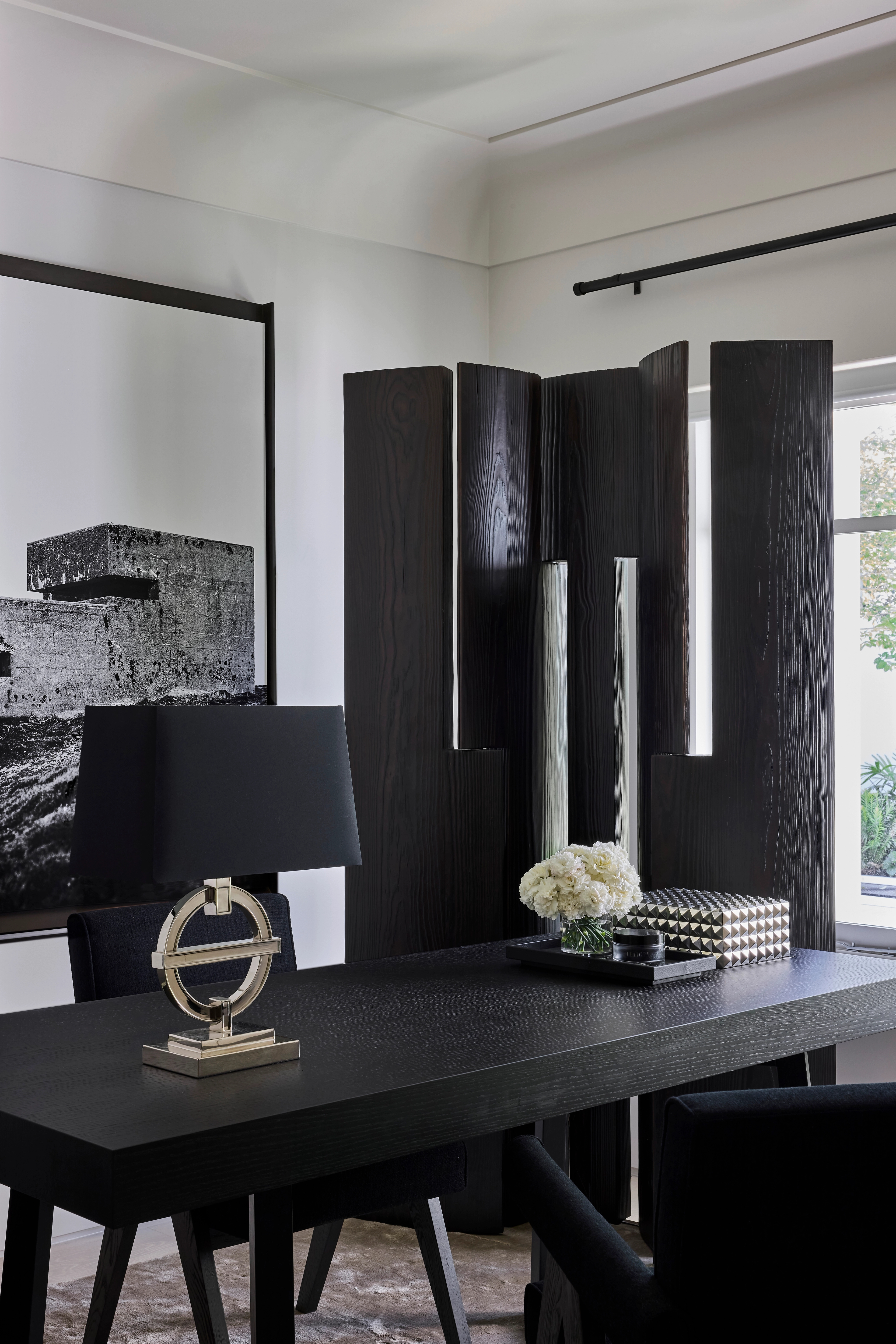 In the study, dark timber volumes and reflective elements create depth, while materials such as oak, marble, metal, and plaster remain central to the design narrative.
